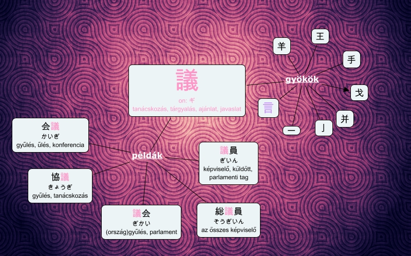 This Concept Map, created with IHMC CmapTools, has information related to: 20130228 BV ZSS, 議 on: ギ tanácskozás, tárgyalás, ajánlat, javaslat példák 総議員 そうぎいん az összes képviselő, 議 on: ギ tanácskozás, tárgyalás, ajánlat, javaslat példák 議会 ぎかい (ország)gyűlés, parlament, 議 on: ギ tanácskozás, tárgyalás, ajánlat, javaslat példák 協議 きょうぎ gyűlés, tanácskozás, 議 on: ギ tanácskozás, tárgyalás, ajánlat, javaslat gyökök 亅, 議 on: ギ tanácskozás, tárgyalás, ajánlat, javaslat gyökök 羊, 議 on: ギ tanácskozás, tárgyalás, ajánlat, javaslat gyökök 一, 議 on: ギ tanácskozás, tárgyalás, ajánlat, javaslat gyökök 戈, 議 on: ギ tanácskozás, tárgyalás, ajánlat, javaslat példák 会議 かいぎ gyűlés, űlés, konferencia, 議 on: ギ tanácskozás, tárgyalás, ajánlat, javaslat gyökök 手, 議 on: ギ tanácskozás, tárgyalás, ajánlat, javaslat gyökök 王, 議 on: ギ tanácskozás, tárgyalás, ajánlat, javaslat példák 議員 ぎいん képviselő, küldött, parlamenti tag, 議 on: ギ tanácskozás, tárgyalás, ajánlat, javaslat gyökök 并, 議 on: ギ tanácskozás, tárgyalás, ajánlat, javaslat gyökök 言