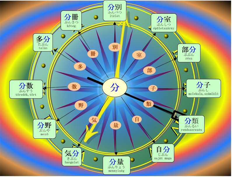 This Concept Map, created with IHMC CmapTools, has information related to: 20121122 KZS, 分 数 分数 ぶんすう töredék,tört, 分 気 気分 きぶん hangulat, 分 部 部分 ぶぶん rész, 分 野 分野 ぶんや mező, 分 量 分量 ぶんりょう mennyiség, 分 自 自分 じぶん saját maga, 分 室 分室 ぶんしつ épületszárny, 分 類 分類 ぶんるい rendszerezés, 分 別 分別 ふんべつ itélet, 分 冊 分冊 ぶんさつ köteg, 分 多 多分 たぶん talán, 分 子 分子 ぶんし molekula,számláló