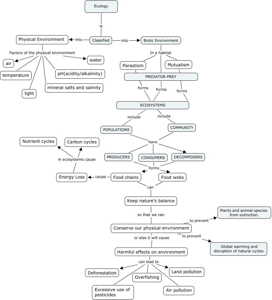 此概念图以 IHMC CmapTools 创建, 内含信息有关于: 1C_Si Yuan Yuan(14)_Ecology_1, Food chains can Keep nature's balance, Energy Loss in ecosystems cause Carbon cycles, Classified into Biotic Environment, Biotic Environment In a habitat Mutualism, Biotic Environment In a habitat PREDATOR-PREY, PRODUCERS forms Food webs, COMMUNITY have DECOMPOSERS, POPULATIONS have CONSUMERS, DECOMPOSERS forms Food chains, Harmful effects on environment can lead to Land pollution, Harmful effects on environment can lead to Deforestation, Physical Environment Factors of the physical environment water, POPULATIONS have DECOMPOSERS, PRODUCERS forms Food chains, Classified into Physical Environment, DECOMPOSERS forms Food webs, Physical Environment Factors of the physical environment air, ECOSYSTEMS include COMMUNITY, Parastism forms ECOSYSTEMS, Conserve our physical environment to prevent Global warming and disruption of natural cycles.