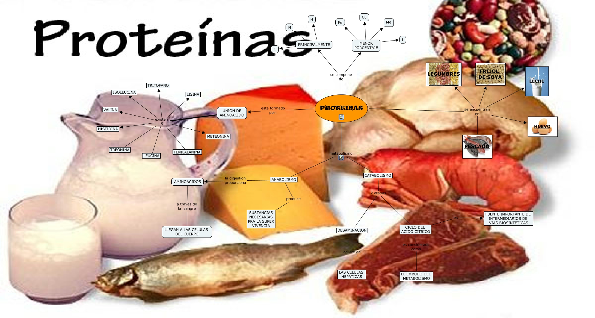 Este Cmap, tiene información relacionada con: PROTEINAS, CICLO DEL ACIDO CITRICO es FUENTE IMPORTANTE DE INTERMEDIARIOS DE VIAS BIOSINTETICAS, UNION DE AMINOACIDO existen 9 METEONINA, UNION DE AMINOACIDO existen 9 FENILALANINA, MENOR PORCENTAJE ???? I, UNION DE AMINOACIDO existen 9 LISINA, PROTEINAS esta formado por: UNION DE AMINOACIDO, PROTEINAS se encuentran en FRIJOL DE SOYA, CATABOLISMO 2 etapas DESAMINACION, PROTEINAS metabolismo ANABOLISMO, PRINCIPALMENTE ???? C, PRINCIPALMENTE ???? N, DESAMINACION ocurre en LAS CELULAS HEPATICAS, UNION DE AMINOACIDO existen 9 VALINA, UNION DE AMINOACIDO existen 9 ISOLEUCINA, PROTEINAS se encuentran en PESCADO, PROTEINAS se encuentran en LEGUMBRES, UNION DE AMINOACIDO existen 9 HISTIDINA, ANABOLISMO la digestion proporciona AMINOACIDOS, MENOR PORCENTAJE ???? Fe, PROTEINAS se compone de MENOR PORCENTAJE